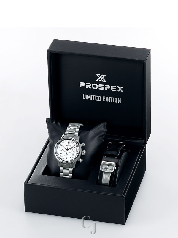 Prospex Speedtimer Limited Edition Mechanical Chronograph. Designed for those who treat life as the ultimate adventure, the Seiko Prospex line meets every challenge with technological excellence and style. Available only in a limited edition of 1,000, with the serial number engraved on each caseback to show its position in a controlled production run, this exceptional watch celebrates Seiko’s first precision chronographs, developed for international sporting competitions in 1964, as well as its 1969 introduction of the world’s first automatic chronograph. Providing chronograph measurement of up to 30 minutes of elapsed time in 1/8-second increments, the 34-jewel automatic movement, visible through the screwdown see-through caseback, beats at a frequency of 28,800 vibrations per hour, with a power reserve of approximately 45 hours and manual winding capability. The proprietary 8R46 movement includes a column wheel and vertical clutch mechanism allowing for smooth, stutter-free movement of the chronograph hand while providing longer wear and efficiency, and maintaining the power reserve better during chronograph operation. Crafted of stainless steel with super-hard coating and tri-fold push button release clasp, this extraordinary timepiece also features a clean white dial with hairline finish and LumiBrite hands and markers, topped by a dual curved anti-reflective sapphire crystal. An additional black leather strap is included in the special collectors’ box. 10 bar, 100M Water Resistant