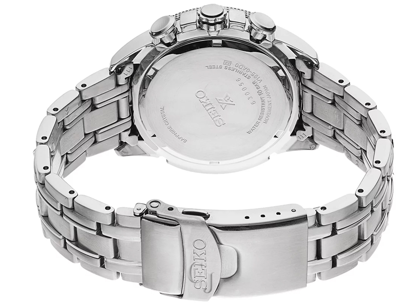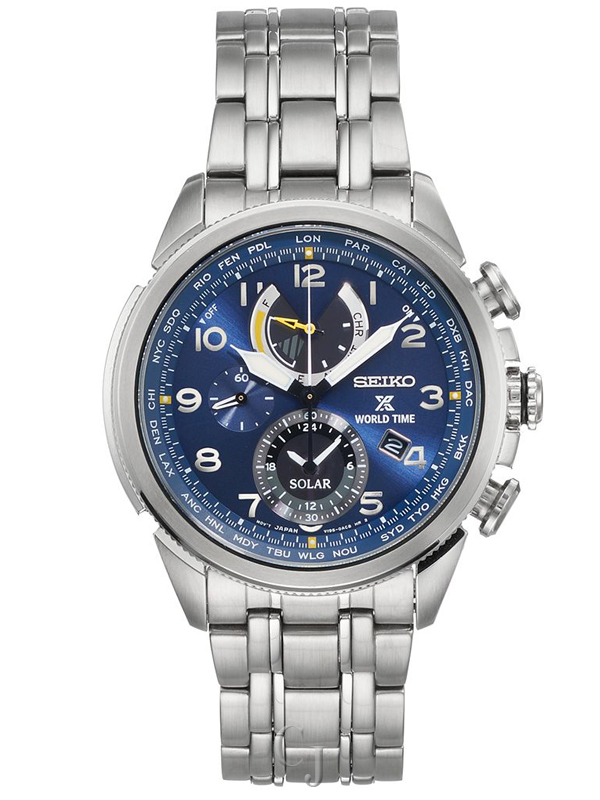 The Seiko SSC507 provides you with a 25 city, world time function. It has 42mm diameter stainless steel case with a date window at 4:00 on the dial. The chronograph measures up to 24 hours in 1/5 second increments with split time measurement function. The watch is powered by a Seiko solar-powered caliber V195 quartz movement that recharges when exposed to light. It has a 6 month power reserve when fully charged (no need for battery changes). A very handy power reserve indicator is located at 12:00 on the dial so you always know the status of your run-time. There is also an alarm feature to keep you on-time for appointments. A scratch resistant sapphire crystal keeps your watch looking new for years to come. This watch is water resistant to 100 meters and it comes on a stainless steel bracelet with a deployant clasp.