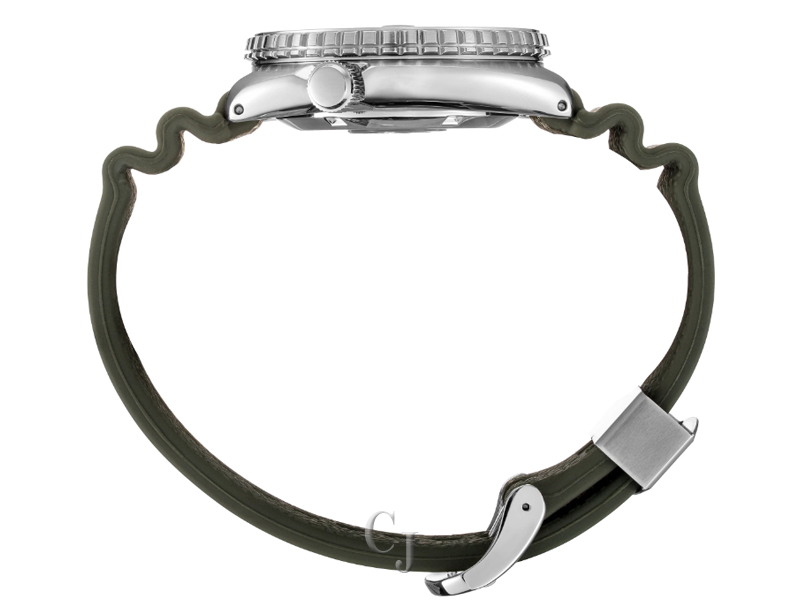 Prospex Special Edition Automatic Diver. Designed for those who treat life as the ultimate adventure, the Seiko Prospex line follows every challenge with technological excellence and winning design. With a Khaki green dial with 3-D pressed pattern, this rugged, yet distinctive, timepiece upgrades an iconic style with a ceramic bezel and a sapphire crystal with anti-reflective coating on the inner surface. LumiBrite hands and markers, and a magnified day/date window ensure legibility in rough conditions. The 24-jewel automatic movement beats at a frequency of 21,600 vibrations per hour, with a power reserve of approximately 41 hours, and can be wound manually or automatically. In stainless steel, with black ceramic one-way rotating elapsed timing bezel, secure screwdown crown and caseback, and durable green silicone strap, this high-intensity watch follows ISO standards for scuba diving. 200m Water Resistant.