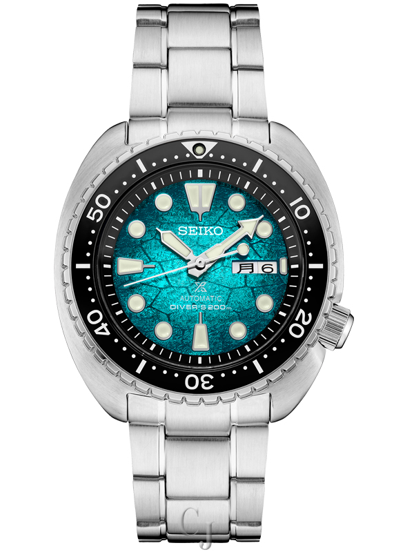 Prospex U.S. Special Edition. Designed for those who treat life as the ultimate adventure, Seiko Prospex keeps moving forward, meeting every challenge with technological excellence and winning design. With an intricately patterned turquoise dial inspired by turtle shells, this exciting Special Edition celebrates Prospex’s official sponsorship of Oceanic Society, America’s first ocean conservation non-profit, and its global work to study and protect the seven species of sea turtles and their ocean habitats. For reliable timing in rough waters, the 24-jewel automatic movement, which beats at a frequency of 21,600 vibrations per hour, provides a power reserve of approximately 41 hours and offers manual winding capability. Framed by a black ceramic uni-directional rotating elapsed timing bezel, the dial features LumiBrite hands and markers, as well as a day/date calendar in both English and Kanji. Crafted of stainless steel, with scratch-resistant anti-reflective sapphire crystal, and secure screwdown crown and Special Edition caseback with sea turtle image, this durable timepiece follows ISO standards for scuba diving at depths of up to 200 meters. Includes additional green silicone strap. 200m Water Resistant