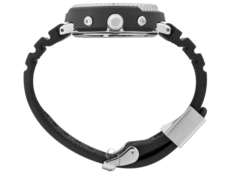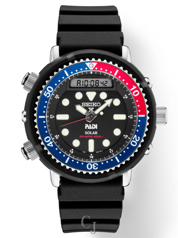 Modern Interpretation of the 1982 Hybrid Diver’s Watch, PADI Special Edition, Solar Diver, Powered by light energy-no battery change required, 6-month power reserve once fully charged, Analogue and digital displays, Power reserve display function, Local time indication mode, Stopwatch function, Alarm, Red and Blue one-way rotating elapsed timing bezel, Black dial, LumiBrite hands and markers, Screwdown crown, pushers, and caseback, Case diameter: 47.8mm, Lightweight matte Black case, Silicone strap, Water-resistant to 200 meters (660 feet), Diver’s Watch. Follows ISO standards and is suitable for scuba diving, Caliber H851