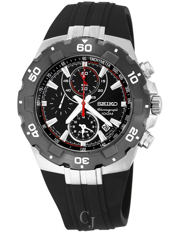 Stainless steel case with a black bracelet. Unidirectional black ion-plated bezel. Black dial with luminous silver-tone hands and index hour markers. Minute markers. tachymeter around the inner bezel. Dial Type: analog. Luminiscent hands and markers. Date display between the 4 and 5 o’clock positions. Chronograph – three sub-dials displaying: 60 seconds, 60 minutes and 12 hours (alarm). Japanese quartz movement. Scratch resistant Hardlex crystal. Silver-tone crown. Solid case back. Case diameter: 45 mm. Case thickness: 12 mm. Band width: 28 mm. Tang clasp. Water resistant at 100 meters / 330 feet. Casual watch style. Seiko Sport Alarm Chronograph Black Bezel Mens Watch SNAD61.