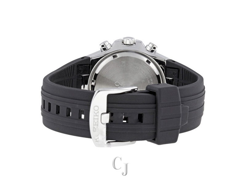 The Seiko Men’s Coutura Alarm Chronograph Watch features a unique alarm subdial for enhanced functionality. Constructed with a stainless steel case, the watch includes a stainless steel one way rotating bezel with a black ion finish, and a urethane strap with a double locking 3 fold clasp with push button release. A durable hardlex window shields the black dial face, which features silver-tone hour indexes, and three chronograph subdials that track the minutes and seconds in addition to offering a specialized alarm function. This quartz-powered timepiece is equipped with a convenient date calendar at 4 o’clock and is 100 meter water resistance (330 feet).