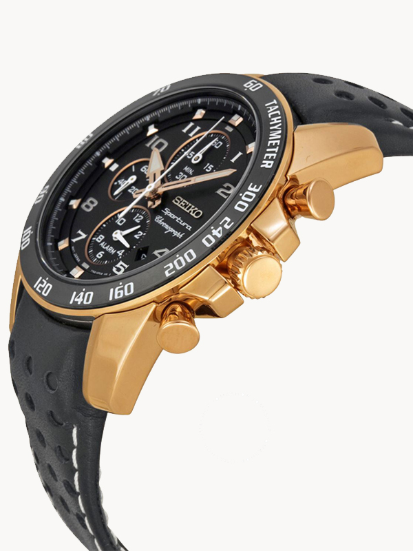 Rose gold ion-plated stainless steel case with a black leather strap. Fixed black ion-plated bezel with tachymeter. Black dial with gold-tone hands and Arabic numberal hour markers. Minute markers appear around the outter rim. Dial Type: Analog. Luminescent hands and markers. Date display between 4 and 5 o’clock position. Chronograph – three sub-dials displaying: 60 minutes, 60 seconds and 12 hours. Quartz movement. Scratch resistant sapphire crystal. Push / pull crown. Solid case back. Case diameter: 44 mm. Case thickness: 12 mm. Tang clasp. Water resistant at 100 meters / 330 feet. Functions: chronograph, hour, minute, second, tachymeter, alar,. Casual watch style. Watch label: Japan. Seiko Sportura Black Dial Chronograph Leather Men’s Watch SNAE80.