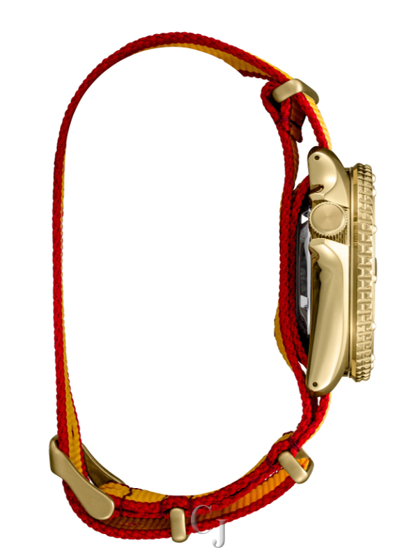 - Red dial with gold accents