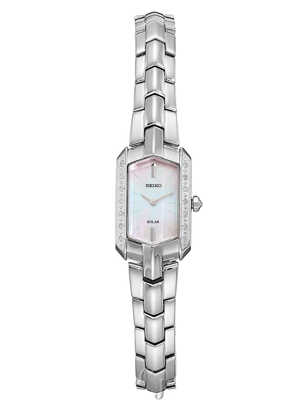 Seiko Tressia Solar. This elegant Ladies’ timepiece is designed with a stainless steel case and bracelet with 14 diamonds adorning the bezel and a pink tone mother-of-pearl dial. Powered by any light energy, its Solar Cell is energy-efficient with a 12-month power reserve once fully charged. No battery change is required. 30M Water Resistant
