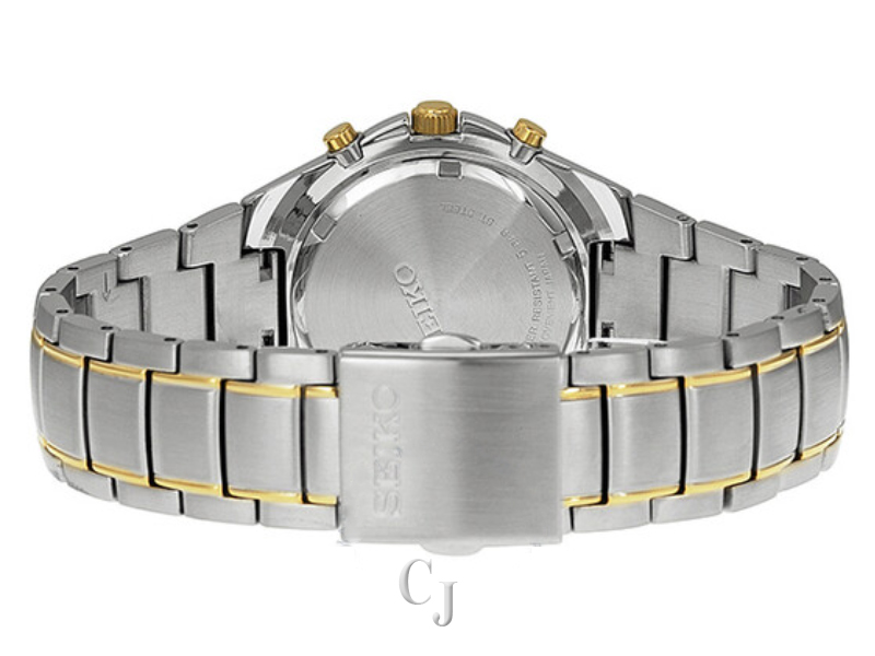 Stainless steel case with a two-tone (silver and gold-tone) stainless steel bracelet. Fixed stainless steel bezel. Blue dial with gold-tone hands and index hour markers. Minute markers around the outer rim. Dial Type: Analog. Luminescent hands and markers. Date display at the 3 o’clock position. Chronograph – three sub-dials displaying: 60 second, 60 minute and 1/20th of a second. Quartz movement. Scratch resistant hardlex crystal. Solid case back. Case diameter: 41 mm. Round case shape. Band width: 20 mm. Deployment clasp. Water resistant at 50 meters / 165 feet. Functions: chronograph, date. Additional Info: date display at 3 o’clock. Casual watch style. Watch label: Japan Movt. Seiko Chronograph Two-Tone Men’s Watch SND585.