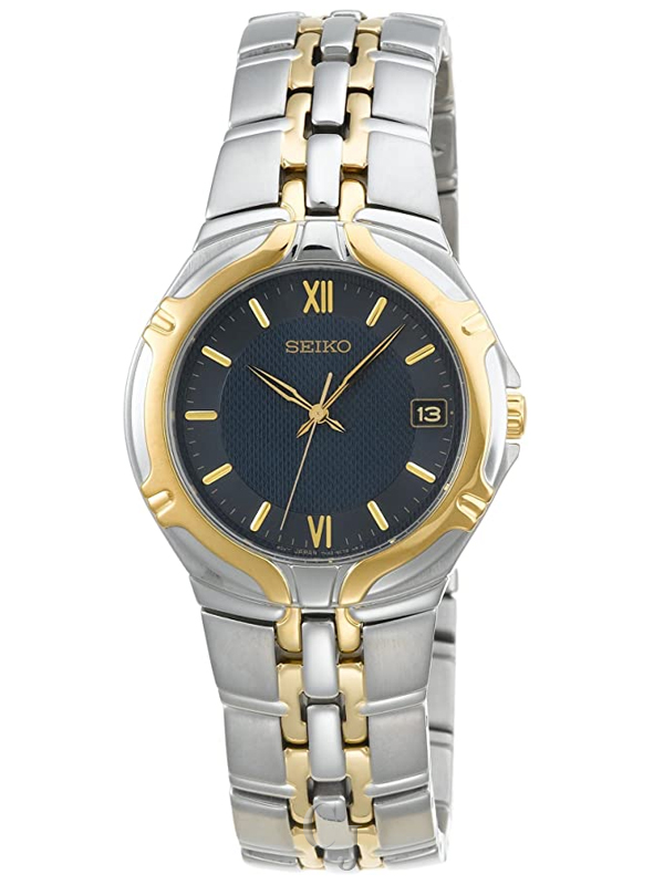 Stylishly powerful, the Seiko SGE514 two-tone stainless steel men’s watch will add a bold emphasis to your business wear. The large, round watch case measures 1.45 inches in diameter. It features a slightly raised bezel that mixes silver and gold-tone stainless steel and has scalloped accents. The gold-tone accents flow into the center of the integrated, contoured bracelet band. The midnight blue dial background has a Guilloche-textured center, a mix of gold dial markers and Roman numerals, and gold baton hands (with second hand). Other features include Japanese quartz movement, date function at 3 o’clock, water resistance to 30 meters (99 feet).