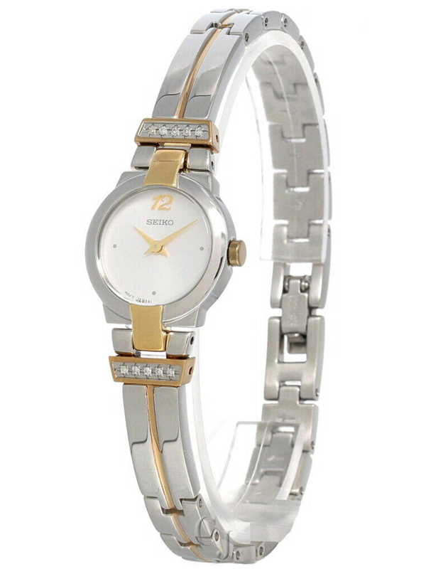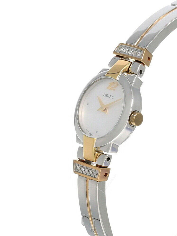 The large links on either side of the face create the bangle look and smaller links continue on the underside to a jewelry style clasp, making the watch comfortable and easy to wear. 5 genuine diamonds set into the watch above and below the face for a total of ten diamonds. The simple white face has a gold 12 and gold hour and minute hands for a striking and simple look that complements the subtle gold-tone case accents. Stainless steel case and bracelet in polished finish with polished gold-tone accents The hardlex crystal is scratch-resistant. Water resistant to 30 meters.