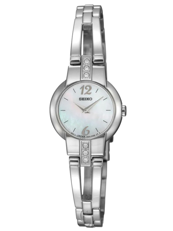 Seiko SUJG45 Dress women’s watch features a 19mm wide and 5mm thick crystal accented solid stainless steel case with a fixed bezel and smooth push-pull crown. Seiko SUJG45 is powered by Japanese IN00 quartz movement. This beautiful watch also features white mother of pearl dial with silver tone luminous hands and index hour markers, scratch resistant hardlex crystal and water resistant to 30 meters. Seiko SUJG45 is equipped with a 8mm wide solid stainless steel bracelet with a fold over push button clasp. Seiko SUJG45 women’s Dress white mother of pearl dial steel bracelet watch is brand new.