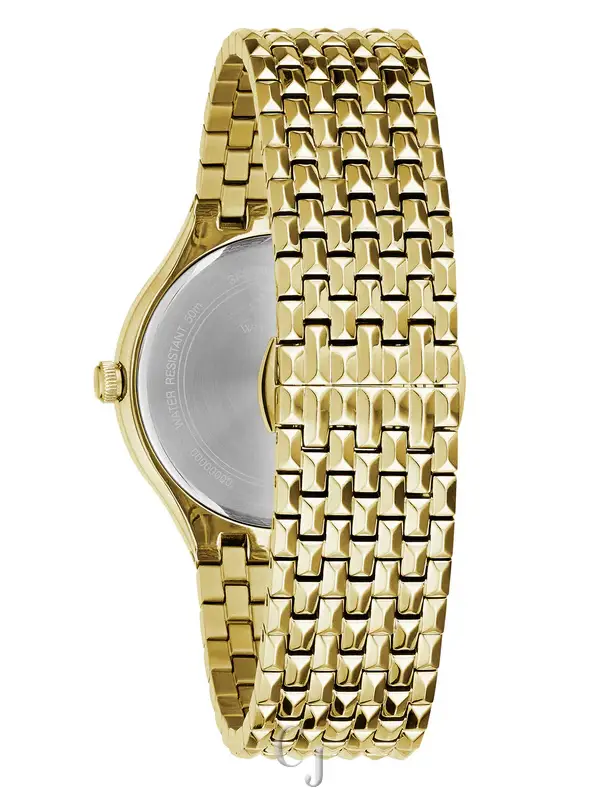 Luxurious and elegant with a halo of 40 hand-set diamonds outlining a black mother-of-pearl dial accented with Roman and faceted indexes for a subtle shimmer. The high polish gold-tone stainless steel faceted link bracelet is reminiscent of a fine jewelry piece. Features a scratch-resistant sapphire crystal and double-press deployant closure.