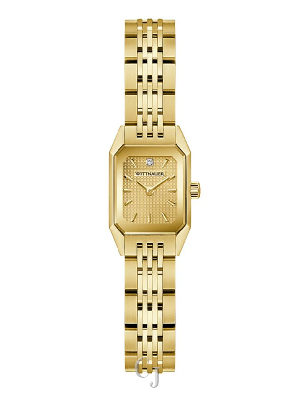 The Wittnauer Women’s Rectangular Diamond Dial Gold-Tone Stainless Steel Watch radiates timeless elegance and modern refinement. Featuring a gold-tone rectangular dial adorned with natural diamond hour markers, this sophisticated timepiece captures the perfect balance of luxury and simplicity. Crafted in polished gold-tone stainless steel, it showcases a seamless design complemented by a scratch-resistant sapphire crystal for lasting brilliance. Powered by a precise quartz movement, this watch ensures reliable timekeeping, while the gold-tone stainless steel bracelet and deployment clasp provide secure, comfortable wear. With 50-meter water resistance, this exquisite design embodies the signature elegance of Wittnauer craftsmanship.