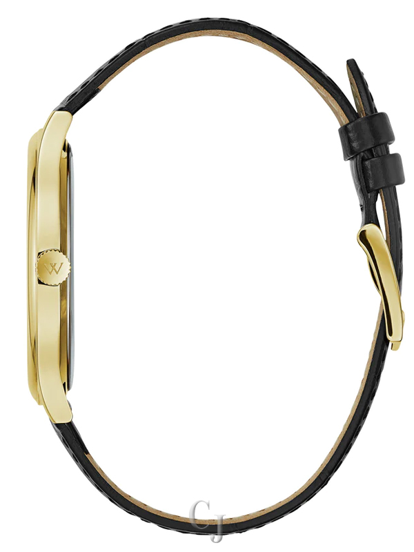 Blending elegance and simplicity, with 8 brilliant hand-set diamonds accenting the minimalist black dial, this sophisticated timepiece in stainless steel with polished gold-tone finish features sapphire glass, black leather strap, and water resistance to 50 meters.