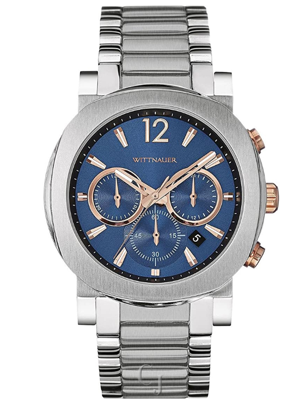 Wittnauer Aiden Blue Dial Stainless Steel Men’s Watch WN3005. 42 mm silver tone stainless steel case with a blue dial, a scratch resistant sapphire crystal, and rose gold tone luminescent hands and markers. Hour markers: indices and Arabic numeral at the 12 o’clock position. Minute markers around the outer rim. Date window in between the 4 and 5 o’clock positions. Logo beneath the 12 o’clock position. Chronograph with 3 subdials. Hands: hours, minutes, and seconds. Case thickness of 11 mm. Push / pull crown. 22 mm silver tone stainless steel bracelet with a deployment clasp. Quartz movement and water resistant up to 50 meters. Style: casual watches. Aiden series.