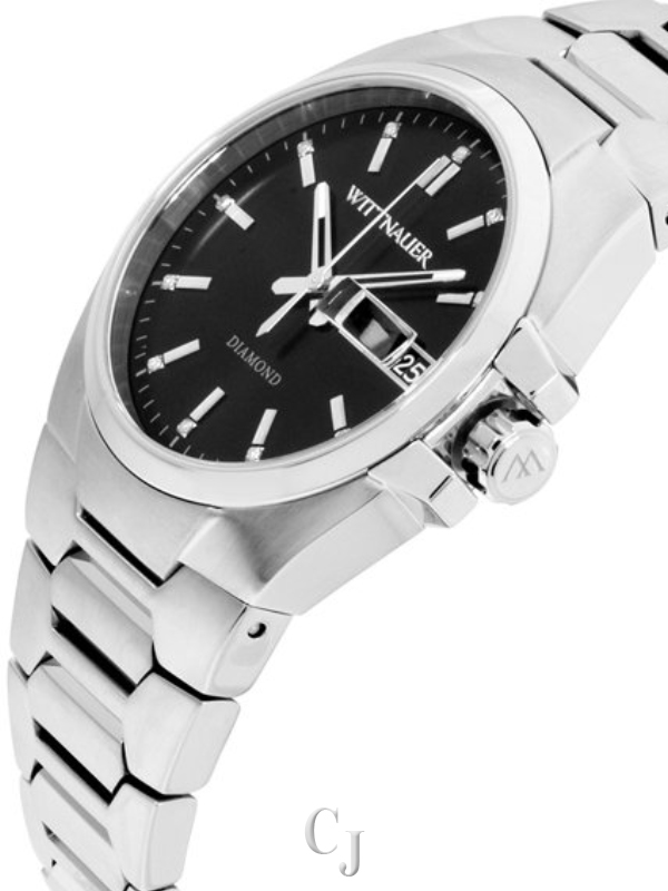 Wittnauer Brody Black Dial Stainless Steel Men’s Watch WN3044. 41 mm silver tone stainless steel case with a black dial, a hardlex crystal, and silver tone luminescent hands and markers. Hour markers: indices individually set with diamonds. Minute markers around the outer rim. Day and date window at the 3 o’clock position. Logo beneath the 12 o’clock position. Hands: hours, minutes, and seconds. Case thickness of 11 mm. Push / pull crown. 22 mm silver tone stainless steel bracelet with a deployment clasp. Quartz movement and water resistant up to 50 meters. Style: casual watches. Brody series.