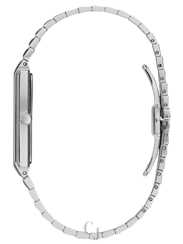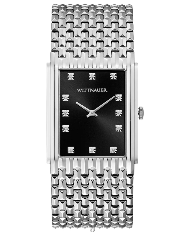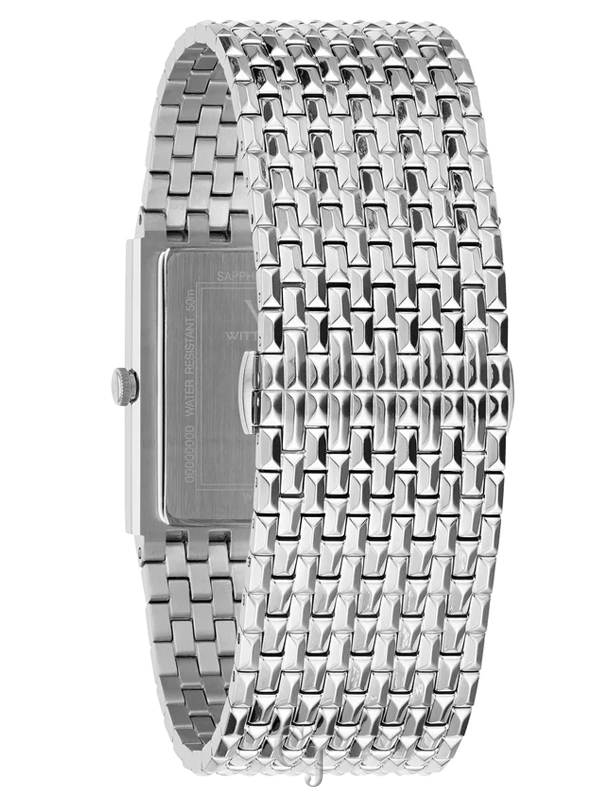 Cosmopolitan with a vintage flair, with 12 diamond markers set on a jet-black dial accented with silver-tone hands. From the fluidity of the high-polish stainless steel faceted links of the bracelet to the bevel edges of the slim rectangular case, this timepiece feels truly luxurious on the wrist; with sapphire crystal and double-press deployant closure.