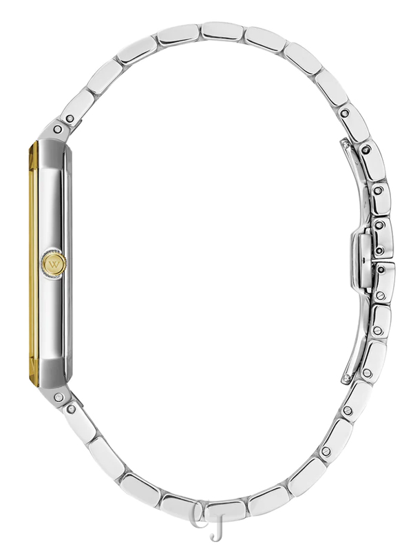 Get a new slant on modern design. Double-layered silver-white dimensional dial gleams with 4 diamonds applied to 12 and 6 o’clock markers. A sleek-and-slim gold-tone stainless steel rectangular case with cut corners boasts a beveled crystal with edge-to-edge gold-tone metallization and screw-back case. The three-link two-tone gold and stainless steel bracelet has a double-press deployant closure.
