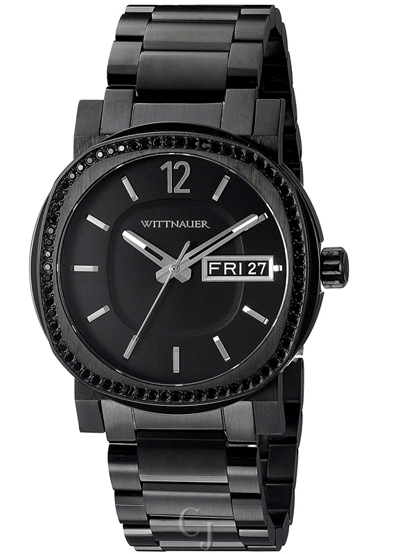 Wittnauer Black Dial Stainless Steel Men’s Watch WN3050. 42 mm black stainless steel case with a crystal-studded bezel (80 black crystals), a black dial, a scratch resistant sapphire crystal, and silver tone luminescent hands and markers. Hour markers: indices and Arabic numeral at the 12 o’clock position. Day and date window at the 3 o’clock position. Logo beneath the 12 o’clock position. Hands: hours, minutes, and seconds. Case thickness of 11 mm. Push / pull crown. 22 mm black stainless steel bracelet with a deployment clasp. Quartz movement and water resistant up to 50 meters. Style: casual watches.