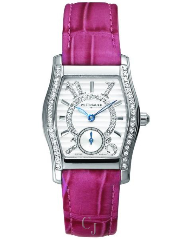 Wittnauer Lady wrist watch from Wittnauer Belasco Collection. Swiss quartz movement, highly polished stainless steel tonneau-shaped case with 36 Diamonds on the bezel and curved sapphire crystal. White dial with modern style numerals and small seconds sub-dial. Comes with an easily interchangeable black and pink color straps.