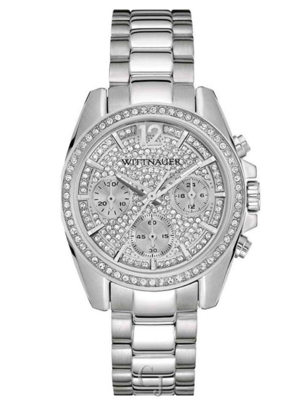 Wittnauer Silver Dial Stainless Steel Ladies Watch WN4077. 34 mm silver tone stainless steel case with a crystal-studded bezel, a silver dial with full pave crystals, a scratch resistant sapphire crystal, and silver tone luminescent hands and markers. Hour markers: indices and Arabic numeral at the 12 o’clock position. Logo beneath the 12 o’clock position. Chronograph with 3 subdials. Hands: hours, minutes, and seconds. Case thickness of 10 mm. Push / pull crown. 20 mm silver tone stainless steel bracelet with a deployment clasp. Quartz movement and water resistant up to 50 meters.