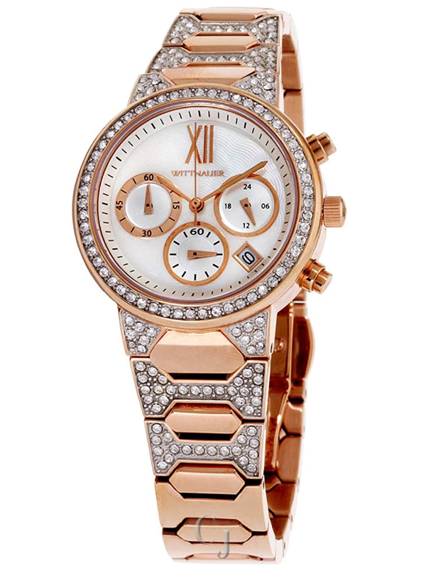 Radiant design with modern sophistication. This women’s chronograph timepiece features a luminous white mother-of-pearl dial accented with rose gold-tone hands and a Roman numeral at 12 o’clock, complemented by minute markers along the outer rim. A date display between 4 and 5 o’clock and three subdials add both elegance and functionality.