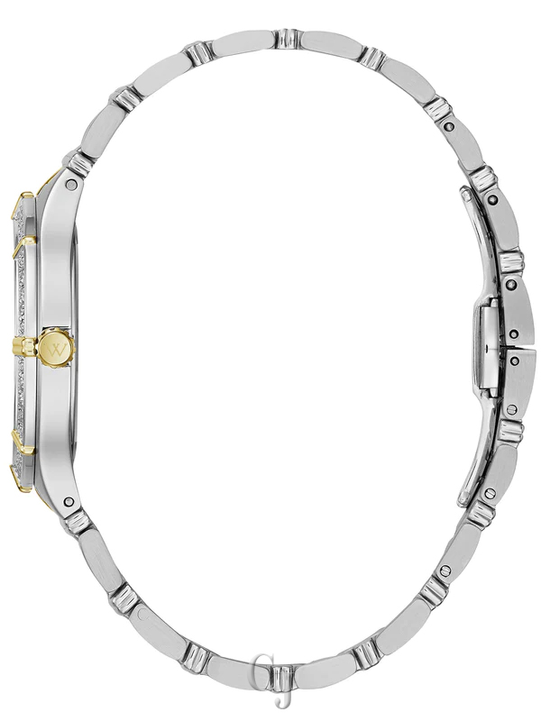 Elegant and refined from every angle in two-tone gold-plated stainless steel with 24 individually hand-set diamonds on the bezel. This dazzling timepiece features a multi-link bracelet with brushed and polished finishes for added dimension. Includes a textured silver dial, hand-applied markers, scratch-resistant sapphire glass, double-press deployant closure, and water resistance to 50 meters.
