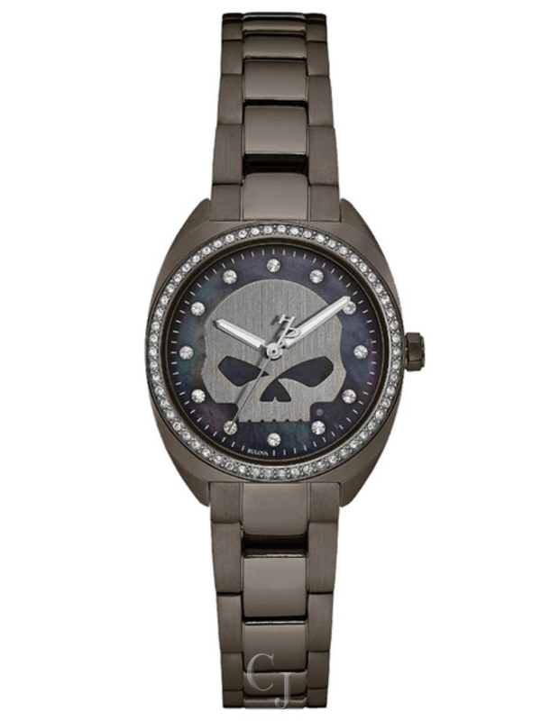 Harley-Davidson® Women’s Bulova Watch. Features 70 beautiful hand-set crystals on bezel and hour markers. Multi-layer black mother-of-pearl dial with vertical brushed applied Willie G Skull detail. White luminous filled hands and white second hand with signature H-D counterweight. Solid stainless steel case and bracelet in an attractive gunmetal ion-plated finish. Snap back. Double-press fold-over clasp with safety lock. Water resistant up to 50m/165ft.