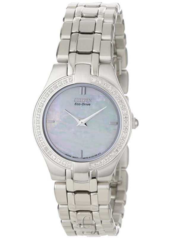Sleek, elegant and ultra-thin, the Citizen Eco-Drive Stiletto collection was introduced as the world’s thinnest light-powered watch. This stainless steel design features a mother-of-pearl dial with stick markers set beneath sapphire crystal, on a round case with 42 diamonds. Featuring our Eco-Drive technology – powered by light, any light. Never needs a battery. Caliber number G670.