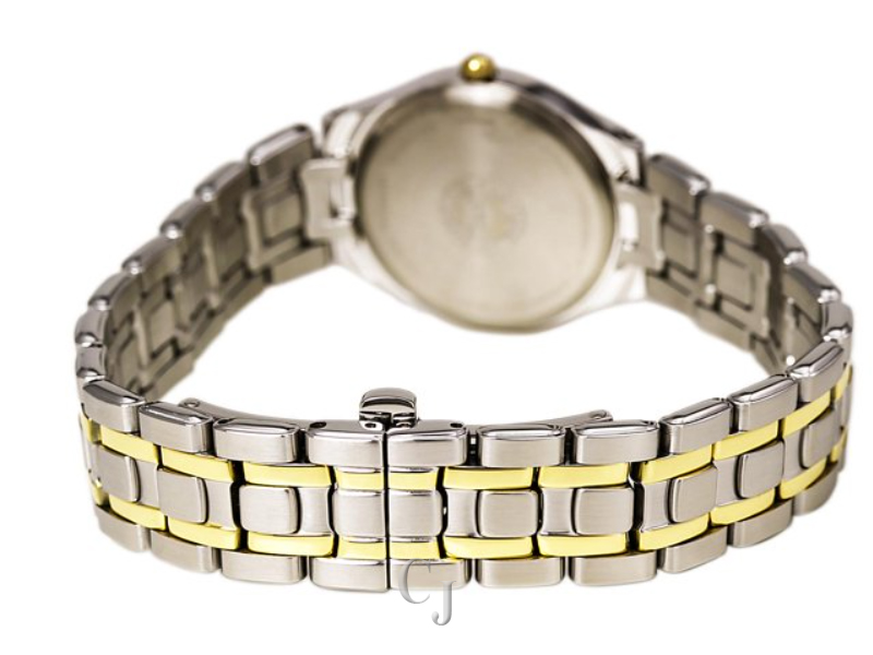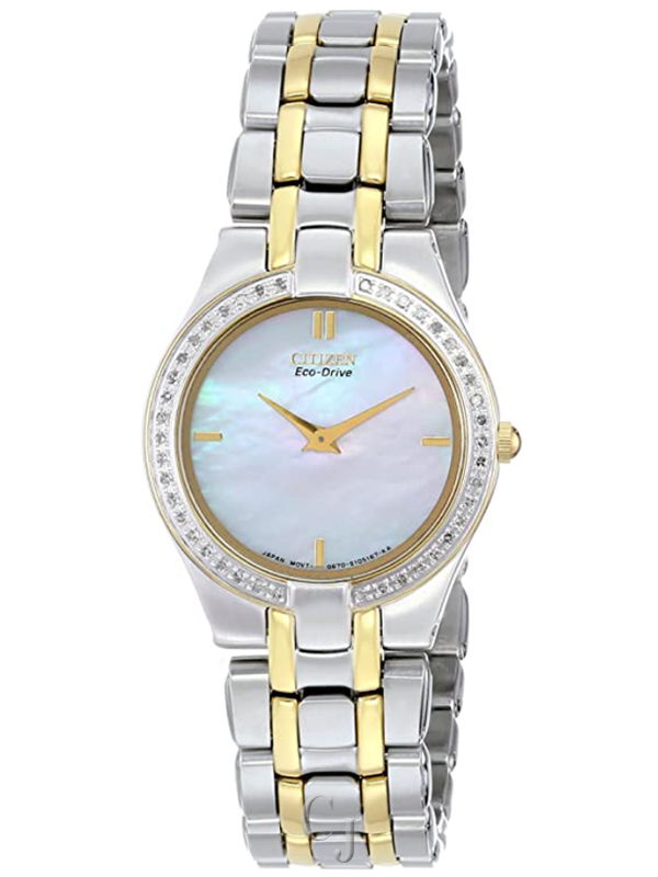 This gorgeous Citizen EG3154-51D Women’s watch features a two tone gold plated stainless steel case with sparkling diamonds set on bezel and link bracelet with push-button deployment clasp. It also comes with high quality solar powered Eco-Drive movement, highly scratch resistant sapphire crystal, water resistant up to 30 meters and white mother of pearl dial with silver tone hands and markers.